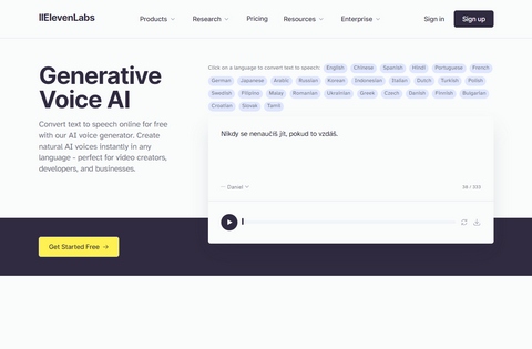 ElevenLabs je společnost specializující se na generování realistických AI hlasů. Jejich text-to-speech nástroj umožňuje vytvářet kvalitní mluvený obsah v různých jazycích a stylech, což je užitečné pro tvůrce videí, vývojáře a podniky. Tento nástroj je napájen modely umělé inteligence, které dokážou reprodukovat lidskou intonaci a inflexe s nevídanou věrností, přizpůsobují doručení na základě kontextu.